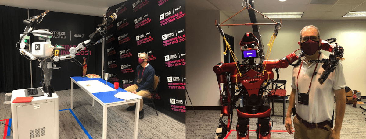 Images: Judge Bill Borgia with two of the many Avatar forms at the ANA Avatar XPRIZE Semifinals. Left: Team Touchlab. Right: Team SNU.